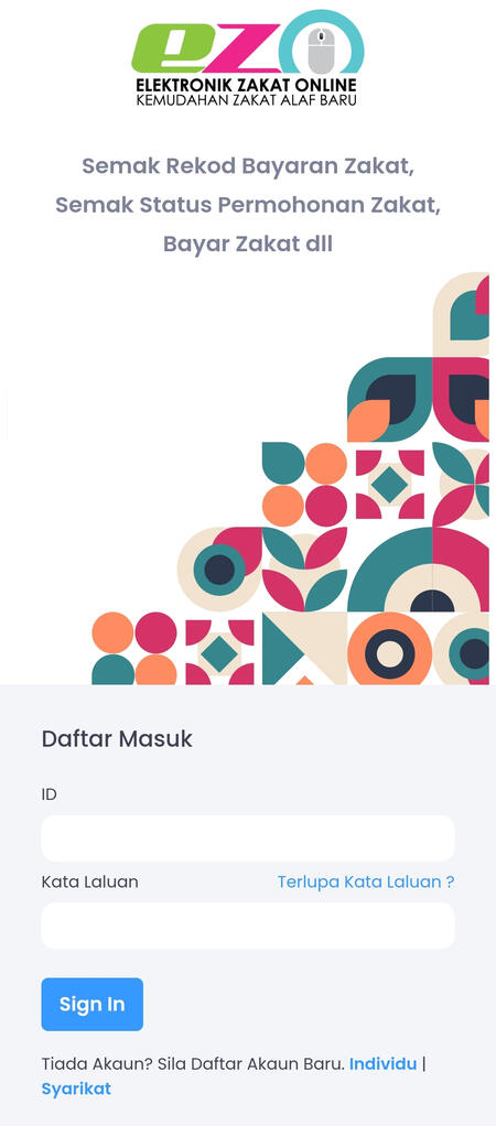 1. Pemohon perlu melayari EZO Zakat Selangor dan membuat Daftar Masuk2. Jika ini merupakan Kali Pertama melayari EZO Zakat Selangor, pemohon perlu Daftar Akaun Baru dibahagian bawah dan pilih Individu3. Jika pemohon merupakan pengguna sedia ada, terus masukkan ID dan Kata Laluan4. Jika pengguna terlupa kata laluan, sila klik pada bahagian Terlupa Kata Laluan