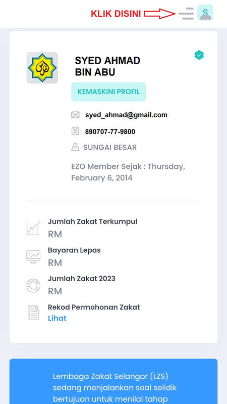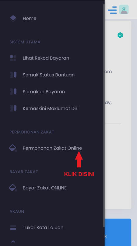 6. Kemudian pilih Menu dan klik Permohonan Zakat Online
