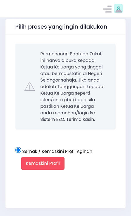 7. Permohonan Bantuan Zakat ini hanya dibuka kepada Ketua Keluarga, jika anda tanggungan, pastikan Ketua Keluarga yang membuat permohonan ini.