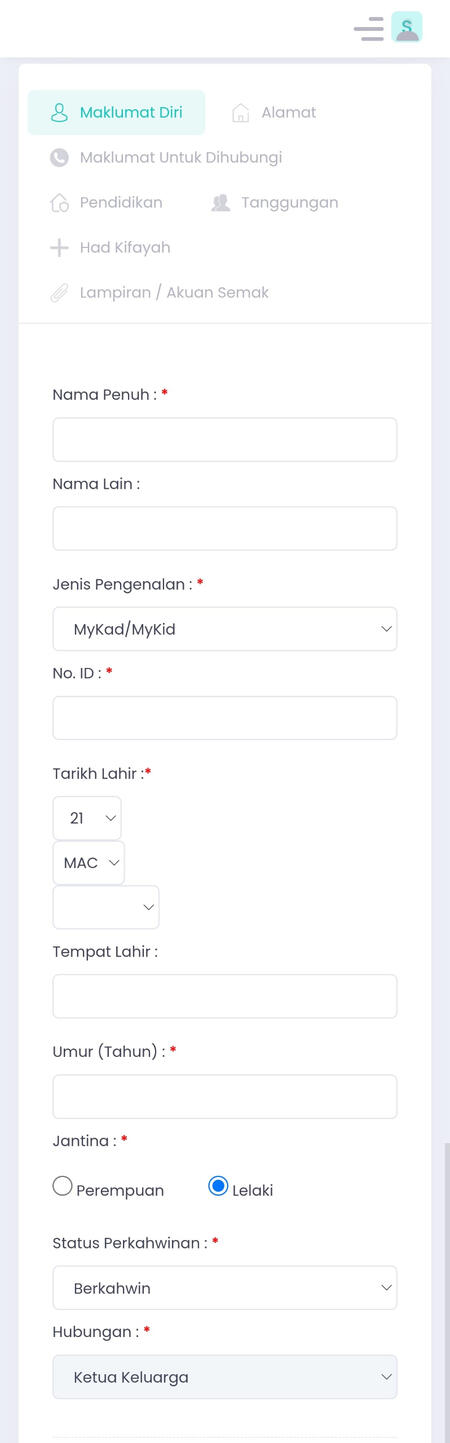 5. Setelah selesai membuat Daftar Masuk, pemohon perlu memilih Butang Menu di bahagian atas dan hujung sebelah kiri.