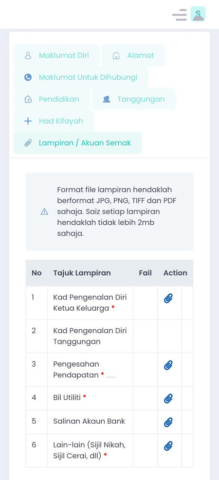 9. Setelah selesai mengisi semua maklumat mengikut halaman, pastikan pemohon perlu melampirkan dokumen yang diperlukan.10. Mohon lampirkan dokumen yang tepat mengikut maklumat yang diperlukan, sekiranya berlaku kesalahan pada lampiran, permohonan ini boleh DIGAGALKAN