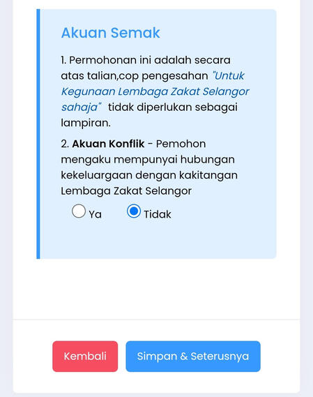 11. Pastikan pemohon membuat Akuan Semak & Akuan Konflik dan Klik pada pautan Simpan & Seterusnya